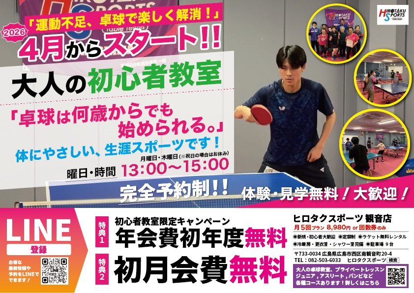 2026年4月より大人の卓球初心者教室がスタートします❗️❗️ 初回特典はなんと 初年度年会費無料❗️❗️月会費1ヶ月無料❗️❗️